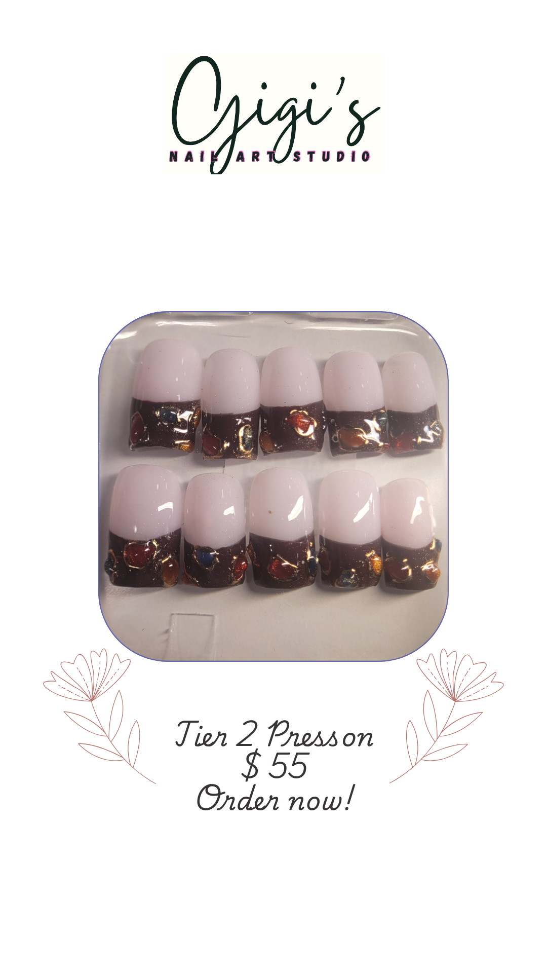 French tip adorned with gem stones made with 3D cat eye. The tip color can be customized as brown or black or dark blue